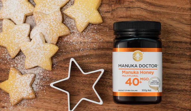 Bánh shortbread ngôi sao giòn tan, kết hợp mật ong Manuka Doctor MGO40+ cho hương vị bơ truyền thống và lợi ích kháng khuẩn tự nhiên.