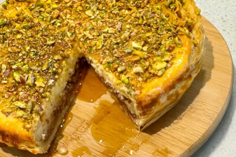 Khám phá công thức độc đáo: Cheesecake mịn màng kết hợp với baklava giòn tan, rưới mật ong Manuka và hạt dẻ phỉ, tạo nên món tráng miệng sang trọng cho mọi dịp.